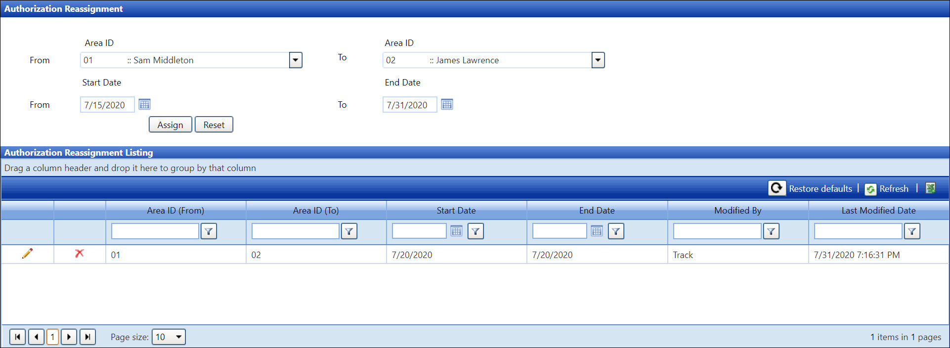 Click the Assign button. The reassignment is saved and displayed in the Authorization Reassignment Listing.